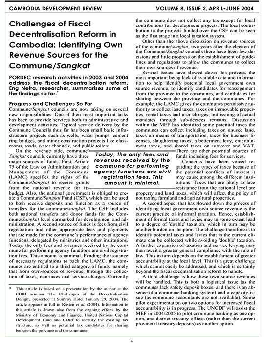 Challenges of Fiscal Decentralisation Reform in Cambodia: Identifying Own Revenue Sources for the Commune/Sangkat