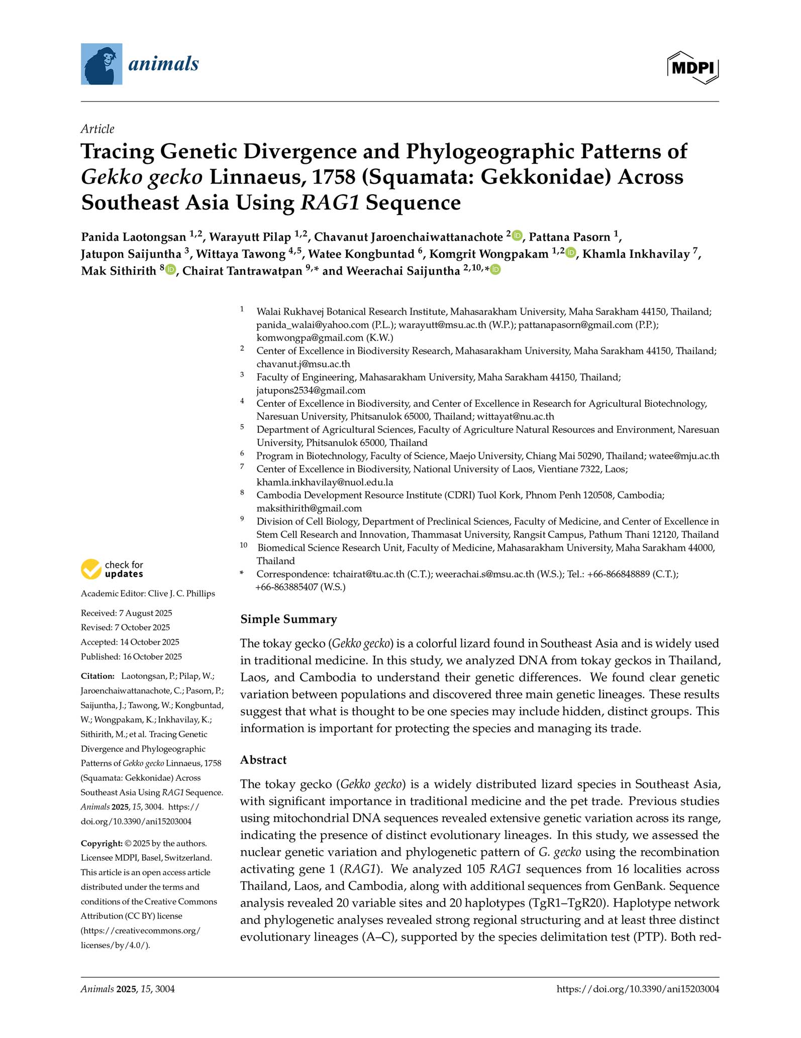 The tokay gecko (Gekko gecko) is a widely distributed lizard species in Southeast Asia, with significant importance in traditional medicine and the pet trade. Previous studies using mitochondrial DNA sequences revealed extensive genetic variation across its range, indicating the presence of distinct evolutionary lineages. In this study, we assessed the nuclear genetic variation and phylogenetic pattern of G. gecko using the recombination activating gene 1 (RAG1). We analyzed 105 RAG1 sequences from 16 localities across Thailand, Laos, and Cambodia, along with additional sequences from GenBank. Sequence analysis revealed 20 variable sites and 20 haplotypes (TgR1–TgR20). Haplotype network and phylogenetic analyses revealed strong regional structuring and at least three distinct evolutionary lineages (A–C), supported by the species delimitation test (PTP). Both red- and black-spotted morphs were present in different clades, indicating that external coloration does not correspond to genetic differentiation at this locus. Our results support the presence of distinct evolutionary lineages in G. gecko and emphasize the importance of integrative taxonomy for accurate species delimitation. These findings have implications for conservation, sustainable management, and regulation of international trade in this commercially exploited species.