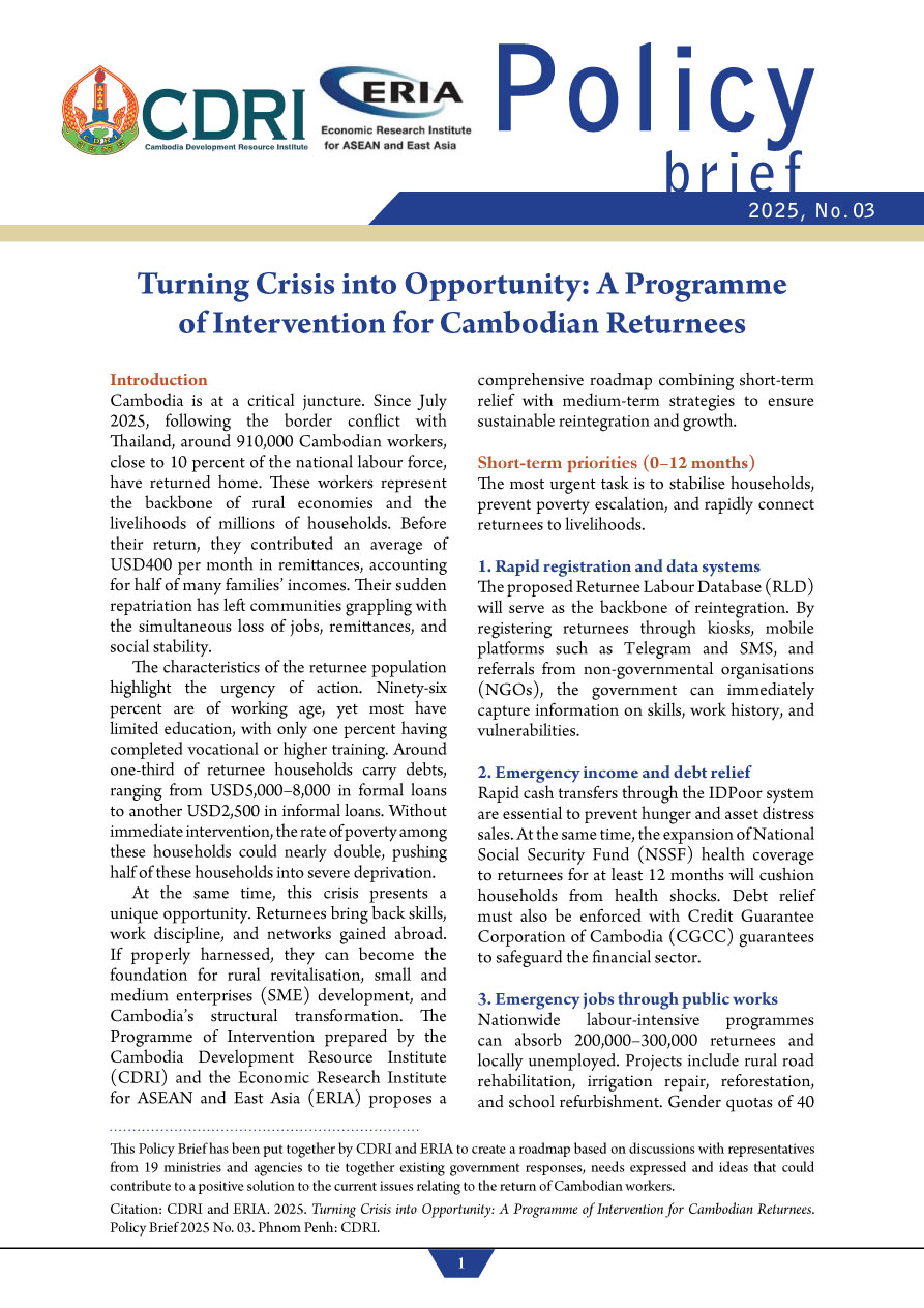 Following the 2025 border conflict with Thailand, nearly one million Cambodian migrant workers have returned home, threatening rural livelihoods and national stability. This policy brief outlines a comprehensive intervention program developed by CDRI and ERIA to address the crisis. It proposes immediate relief through cash transfers, job creation, and debt support, alongside medium-term strategies for agro-processing, SME development, and industrial diversification. By leveraging returnees’ skills and networks, the programme aims to transform a humanitarian crisis into a catalyst for inclusive growth, economic resilience, and structural transformation in Cambodia.